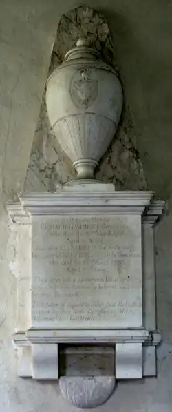 - "Sacred to the memory of Richard Hammett, Gentleman, who died the 26th March 1766 aged 59 years and also Elizabeth his wife (only daughter and child of Philip Risdon, Gentleman) who died the 24th March 1787 aged 77 years. They have left a numerous issue by whom they were most deservedly beloved and will be ever lamented. This token of respect to their good parents is erected by their three daughters Mary, Thomazin & Gertrude"