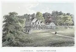 His other brother, Capt. Thomas Parry Jones-Parry, married the daughter of Vice-Admiral Robert Lloyd, and became Magistrate, Deputy Lieutenant, and High Sheriff of Caernarvonshire.[4] Thomas was also the proprietor of the Llwyn Onn estate, which was in their family since at least the 15th century, and the Aberdunant estate.[14] Aberdunant will be inherited by his grandson, Thomas Edward John Lloyd, who will also inherit the property of his great-grandfather, Vice Admiral Robert Lloyd, which included the Tregayan estate in Anglesey and the Gesail Gyfarch estate in Caernarfonshire.[14]