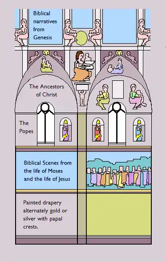 At this point, the decorative scheme displayed a consistent iconographical pattern. The tier of Popes, which, in the scheme intended by Pope Julius, would have appeared immediately below the Twelve Apostles, would have emphasised the apostolic succession. It has been argued that the present scheme shows the two Biblical Testaments merged in order to reveal the Old predicting and framing the New, synthesizing the logic of the Christian Bible.[23]