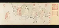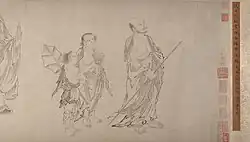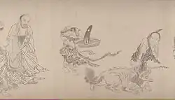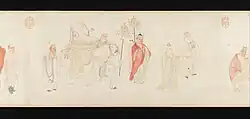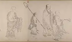 The Sixteen Arhats (Chinese: 十六羅漢, pinyin: Shíliù Luóhàn, Rōmaji: Jūroku Rakan; Tibetan: གནས་བརྟན་བཅུ་དྲུག, "Neten Chudrug") are a group of legendary Arhats in Buddhism. The grouping of sixteen Arhats was brought to China, and later to Tibet, from India. In China, an expanded group of Eighteen Arhats later became much more popular, but worship of the sixteen Arhats still continues to the present day in China, Japan and Tibet. In Japan sixteen Arhats are particularly popular in Zen Buddhism, where they are treated as examples of behaviour.[1] In Tibet, the sixteen Arhats, also known as sixteen sthaviras ('elders') are the subject of a liturgical practice associated with the festival of the Buddha's birth,[2] composed by the Kashmiri teacher Shakyahribhadra (1127-1225).[3] They are also well represented in Tibetan art.[4]