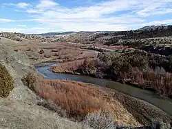 Sixteen Mile Creek is one of the more historically important areas in Montana. Its name derives from the fact that it enters the Missouri River 16 miles (26 km) downstream from Three Forks, Montana. The rail bed of the original Montana Railroad runs through this creek canyon, which includes some really outstanding scenery. The Milwaukee Road abandoned this line in 1980.[3]