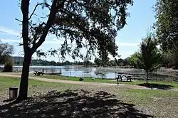 The Cameron Park Lake area features a developed lake, that is part of the Deer Creek that flows through western El Dorado County, and into eastern Sacramento County.[29] The lake is surrounded by a walking track. The park includes a disc golf course, tennis courts, fishing, extensive picnicking and wildlife viewing areas. There is a fee to enter Cameron Park Lake.[30]