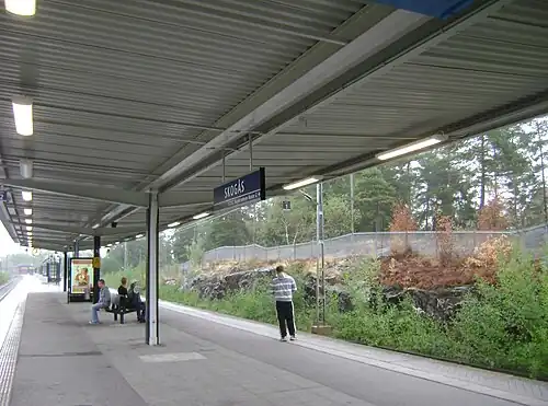 Skogås is a station on the Stockholm commuter rail network, located in the district of Skogås within Huddinge Municipality on the Nynäs Line, 19.9 km from Stockholm Central Station. The station features a central platform with two ticket halls. As of 2015, Skogås had approximately 4,400 boarding passengers per day.[1]