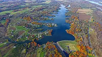 Sleepy Hollow Lake is a recreational lake and residential community (and census-designated place)[1] in Greene County, New York, United States, located 120 miles north of New York City and 28 miles south of Albany in the Hudson River Valley. The lake is a two and one-half mile long, 324 acre, 70 foot deep man-made, Class “A” drinking water reservoir for the neighboring communities.[2] It is surrounded by a 2,200 acre residential community, also known as “Sleepy Hollow Lake”, which is a Planned Unit Development (PUD) that self-governs residential land use, maintains common roads, parks, beaches, and other recreational facilities, operates most of the development's sewer and water services, and provides community security and code enforcement. The community is within the viewshed of the Taconic Mountains to the east and the Catskill Mountains to the west. The community was featured in a 2015 episode of the HGTV series Lakefront Bargain Hunt.[3]