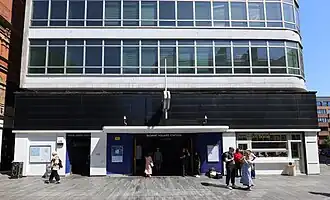 The entrance to the station is on the east side of Sloane Square (A3217). It is adjacent to the Royal Court Theatre and is the nearest station for King's Road shopping, the Peter Jones department store and the Cadogan Hall.[7]
