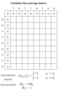 - Initialize the scoring matrix. The dimensions of the scoring matrix are 1+length of each sequence respectively. All the elements of the first row and the first column are set to 0. The extra first row and first column make it possible to align one sequence to another at any position, and setting them to 0 makes the terminal gap free from penalty.