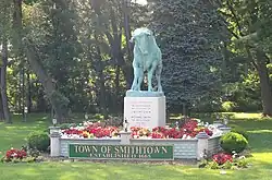 An oft-repeated but apocryphal story has it that, after rescuing a Native American chief's abducted daughter, Richard Smith was told that the chief would grant title to all of the land Smith could encircle in one day while riding a bull. Smith chose to ride the bull on the longest day of the year (summer solstice) 1665, to enable him to ride longer "in one day." The land he acquired in this way is said to approximate the current town's borders.[3] A large statue of Smith's bull, known as Whisper, pays homage to the legend at the fork of Jericho Turnpike (New York State Route 25) and St. Johnland Road (New York State Route 25A).[4][5]