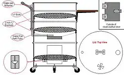 The upright drum smoker (also referred to as an ugly drum smoker or UDS) is exactly what its name suggests: an upright steel drum that has been modified for the purpose of pseudo-indirect hot smoking. There are many ways to accomplish this, but the basics include the use of a complete steel drum, a basket to hold charcoal near the bottom, and a cooking rack (or racks) near the top, all covered by a vented lid of some sort. These smokers have been built using many different sizes of steel drums, such as 30 US gallons (110 L; 25 imp gal), 55 US gallons (210 L; 46 imp gal), and 85 US gallons (320 L; 71 imp gal), but the most popular size is the common 55-gallon drum.
