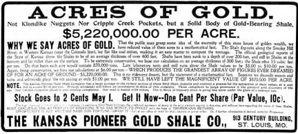 The idea that the shales of along the Smoky Hill River contained valuable minerals started in the mid-19th century as a swindle by Native Americans who said that they knew of tin mines along the Smoky Hill. In the 1890s, prospectors imagined that they found zinc in the shale of Ellis and adjacent Trego County, and then believed that they found gold. The delusion was abetted by unscrupulous assayers, and by swindlers selling secret metallurgical processes to extract gold from the shale. Vigorously warning against the gold delusion was Kansas state geologist Erasmus Haworth, even though the influential promoters threatened to have him fired for his opposition. The Ellis County gold boom sputtered along from 1895 to 1903, by which time (almost) everyone realized that there was no recoverable gold in the shale.[1]