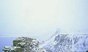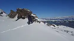 Haslum Crag is a prominent rock crag close to the island's north coast. It stands 2 nautical miles (4 km) northeast of ice-free Station Nunatak, which rises 150 m (490 ft) tall. They were first seen by members of the Swedish Antarctic Expedition (SAE), 1901–04, under Otto Nordenskiöld, and surveyed by the Falkland Islands Dependencies Survey in 1952.[8][9] Nordenskiöld named Station Nunatak because of its proximity to the expedition's winter station, and he gave Haslum Crag its original name, "Basaltspitze".[9] Concerned that "Basaltspitze" could be mistaken for descriptive information, the United Kingdom Antarctic Place-Names Committee changed it to Haslum Crag, honoring H.J. Haslum, second mate on the Antarctic, the ship of the Swedish expedition.[8] This area of the northeast coast consists of Cretaceous sedimentary rocks with abundant fossils of ammonites, gastropods, and bivalves. There are numerous basalt dikes that project up through the sedimentary rocks near the station Nunatak.[10]