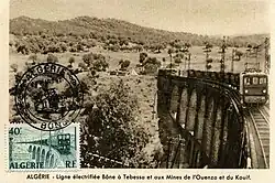 The government took over the Bône-Guelma line and widened it from Souk Ahras to the Ouenza and onward to Tebessa.[7] A 24 kilometres (15 mi) narrow-gauge railway from the Djebel Ouenza mine to the Algerian railway network at Oued Keberit station was opened in March 1921 and mining began. Production reached 225,000 tons in 1922. A branch railway line from Bou Khadra to Ain Chenia was opened in early 1929 and mining operations began at Bou Khadra.[1] The Société de l'Ouenza overtook the Société Mokta El Hadid as the largest mining company in Algeria in 1927.[8]