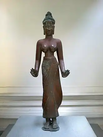 Buddhism was widely represented in Champa's court culture. Its flexibility regarding the number of worshipped deities allowed the inclusion of ancestor worship, particularly of female ancestors. Additionally, Cham Buddhism, with a strong inclination toward Vajrayana, incorporated many local spirits and esoteric imagery. Cham architecture rarely featured funerary monuments like stupas, intended for storing relics. Only the unique Buddhist sanctuary of Dong Duong preserved small stupas. Apart from the iconography of Buddha and bodhisattvas, little distinguishes Buddhist temples from Hindu ones in Champa.[70]
