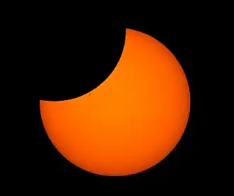 A partial solar eclipse occurred at the Moon’s ascending node of orbit on Saturday, April 30, 2022,[1][2][3][4] with a magnitude of 0.6396. A solar eclipse occurs when the Moon passes between Earth and the Sun, thereby totally or partly obscuring the image of the Sun for a viewer on Earth. A partial solar eclipse occurs in the polar regions of the Earth when the center of the Moon's shadow misses the Earth.