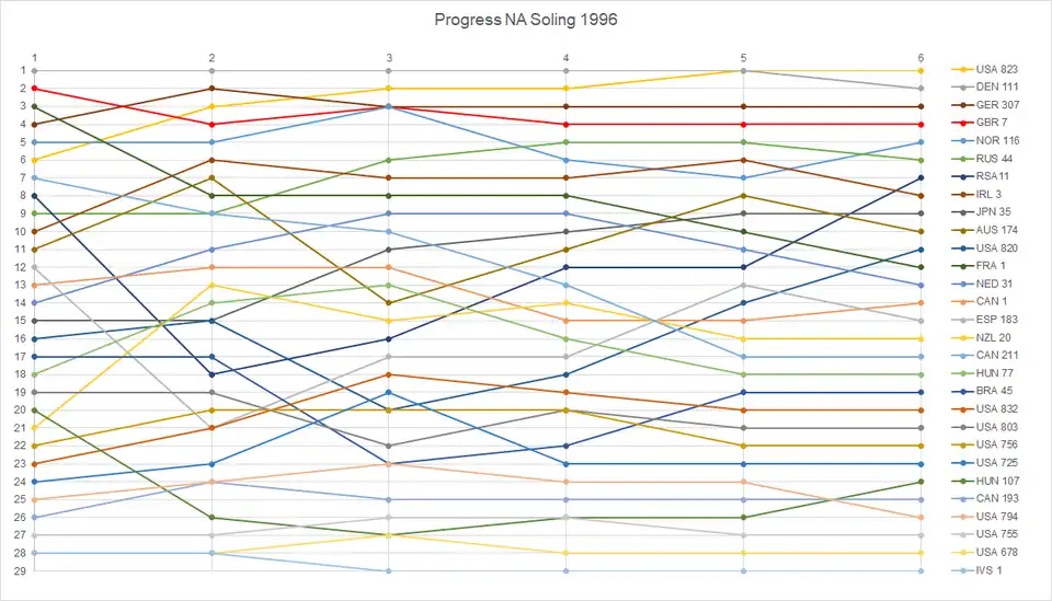 Rank | Country | Helmsman | Crew | Sail No. | Race 1 | Race 2 | Race 3 | Race 4 | Race 5 | Race 6 | Race 7 | Total | Total – discard | |||||||