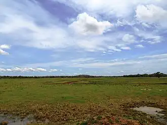 Somawathiya National Park lies in the deltaic flood plains of the Mahaweli River and contains the junction where it is forked into two branches.[4] The two branches are the Mahaweli River, which flows north into Koddiyar bay and the lesser Verugal Oya which flows north-east into the sea. The central riparian flood plain is featured by many old river channels and contain dispersed 'villus', the waterfilled basins around among the grassy plains. There are 20 such villus is located in the park.[3] Somawathiya and Flood plains national parks are important protected areas for the wetland system of Mahaweli River flood plains.[5] The high quality habitat of fertile alluvial underlying layer supports a plentiful wildlife.[4]
