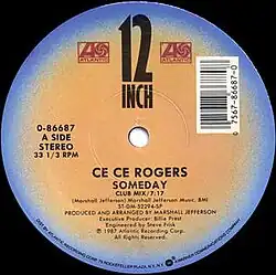 "Someday" is a song by American singer-songwriter CeCe Rogers. It is well-known for its recognisable piano riff and widely acclaimed for its influence on electronic music culture. Marshall Jefferson wrote the lyrics to "Someday" and recruited Rogers to sing the vocals after seeing him in a show with 'Ce Ce & Company'. Jefferson recorded Rogers' warm up vocal. When Rogers said he was ready to start recording the first take, Jefferson told him they had already finished. It was the greatest vocal performance Jefferson had heard on a dance record, but Rogers wanted to re-record it and he did it. Rogers was signed to Atlantic Records, making "Someday" the first house-music song released by a major label. The track went on to sell millions, a landmark release for house music. British band M People released a cover of the song in 1992.