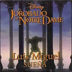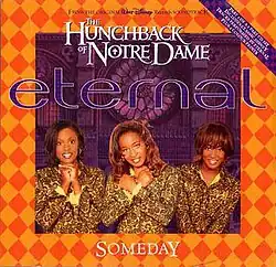 Selected as the lead single from the film's soundtrack in 1996, "Someday" was recorded by all–male R&B group All-4-One for the North American release, while British female R&B trio Eternal recorded their own version for the British English version of the song that received international release throughout Europe and Oceania. Mexican singer Luis Miguel recorded a Spanish version for the Latin American market, retitled "Sueña", which became a major hit. The French version was recorded by Ophélie Winter, retitled "Un Jour". The Italian version was recorded by Neri per Caso, retitled "Quando". The youngest Celtic Woman member Chloë Agnew covered this song for her solo album called Walking in the Air and her first Celtic Woman album. Jackie Evancho covered this song for the Target deluxe version of her album Dream With Me.[1] The Korean version was recorded by R&B trio Solid, which was released in Korea as a bonus track of the original soundtrack album.[2] In 2016, the song was included in the musical version of the film as performed by Ciara Renée and Andrew Samonsky as Esmeralda and Phoebus.