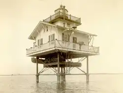 Little is known about this minor light, other than that it was constructed in 1867 to at the cost of $10,000 (equivalent to $225,000 in 2024).[1] Unlike many other screw-pile lighthouses it was apparently never threatened by ice, and thus passed a quiet life until it was dismantled in 1932, replaced by a skeleton tower. The ferry to Tangier Island passes its remains.