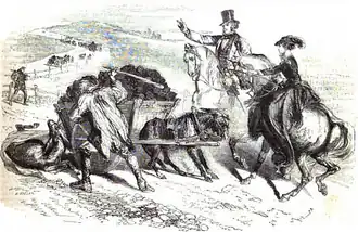 Not all roads were improved, and in 1819 John Skinner observed roads "rendered bad" by the passage of coal wagons.[25] Expansion of production was limited by access to market. Such a need implied a canal project, following Lord Middleton's dictum "Water transport is what all coal owners must aim at". There were large gains from being connected to a canal system, as stated by the Coal Commission: "At about this period (1800) the system of coal navigation was being rapidly extended, and the result was that coals were gradually finding their way into districts that could not be reached unless at great cost, by road".[26]