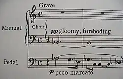 The opening theme of the piece provides the basis of all the rest of the thematic material. This music is an interpretation of the text 'Herr, Gott, des die Rache ist, erscheine'; a head-motif is followed by a descending chromatic scale. Ascending chords on the manual follow, a musical invocation of God. The development section of the first movement, from the allegro con fuoco, depicts the second group of verses, leading into a recapitulation in organo pleno.