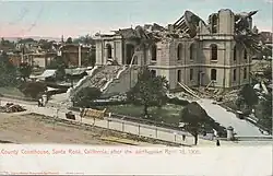 After the 1885 courthouse was destroyed in the 1906 San Francisco earthquake, a replacement was completed in 1910, designed by J.W. Dolliver.[7] Following an earthquake in 1957, an examination of what was initially thought to be superficial damage to the building's fascia led to an estimate of $425,000 in needed repairs. The terra cotta cladding was stripped in 1958, and a consultant for the city recommended abandoning and selling the building.[8] The 1910 replacement was demolished in 1966 after being declared seismically unsafe; the site was rededicated as "Old Courthouse Square" in 1967.[9] The 1910 building, which had included a significant amount of reinforcing steel, was so sturdy the contractor hired to demolish it was unable to complete the razing within the 75-day window allotted.[8]