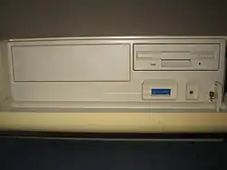 Both 680x0 and MIPS models share the same case, which has a large door covering a 3 1/2" micro-diskette drive and a 5.25-in expansion bay, which can house a SCSI tape or CD-ROM drive. The details of the door are slightly different: two windows for the 680x0 models, while the MIPS ones have a single large window. Also hidden by the cover are a reset button and a series of DIP switches used to configure some bootup parameters.