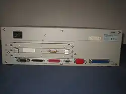 On the back are 3 expansion slots, one of which normally houses a video card. Underneath those are connectors for SCSI, network (an AUI connector), serial (CH0, normally used for console, and CH1), parallel, and a keyboard.