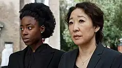 Both Burt and Nguyen discuss the shot of Eve's face during the funeral scene, with Burt saying that the camera staying "glued to her pained face for much longer than we are used to" traps the viewer in Eve's guilt-laden mind.[1] Nguyen says that the "simplest approach" allows Eve "to just be" and is "especially effective when she must deal with grief", which she claims Sandra Oh makes "riveting".[2]