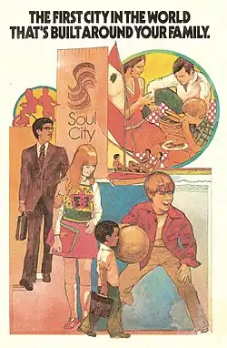 The city was planned to contain three villages housing 18,000 people by 1989. Soul City was projected to have 24,000 jobs and 44,000 inhabitants by 2004.[52] It was intended to include industry and retail development for jobs, as well as residential housing and services. The plan was for residents to work, get schooling, shop, receive health care, and worship in town. Soul City was the first new town to be organized by African-American businesses. McKissick envisioned Soul City as a community where all races could live in harmony.[53]