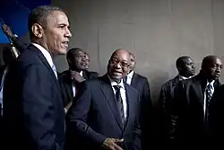 The election of Obama along with Mbeki's departure from office as well as the enactment of the African Growth and Opportunity Act (AGOA) with South Africa as a key beneficiary greatly improved opinions within the South African government of its relation with the United States. As of 2014 the relation between South Africa and the United States in the Zuma/Obama years is thought not to be as close as it was during the Mandela/Clinton years but greatly improved since the Mbeki/Bush years.[44] The Zuma years coincided with a continuation of cooling of South Africa–United States relations whilst China–South Africa relations warmed significantly[47] as South Africa focused diplomatic efforts supporting the BRICS initiative.