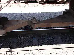 The locomotive has interlinked bogies, hence the Co+Co wheel arrangement classification. The linkage is usually hidden from view by the saddle-shaped fuel tank.