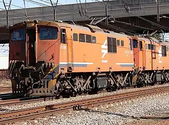 Beginning in 2000, Spoornet began a project to rebuild Series 2 to 11 Class 6E1 locomotives to Class 18E, Series 1 and Series 2 at the Transnet Rail Engineering workshops at Koedoespoort. In the process the cab at the no. 1 end was stripped of all controls and the driver's front and side windows were blanked off to have a toilet installed, thereby forfeiting the locomotive's bi-directional ability.[4][5]