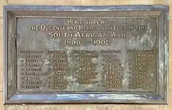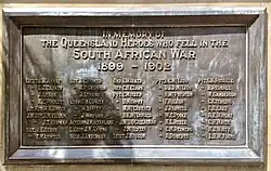 On two sides of the trachyte pedestal large bronze plaques contain the names of the eighty-nine Queensland soldiers who lost their lives in the South African war.[1]