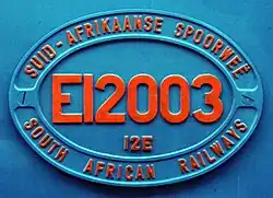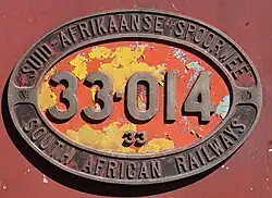 The traditional number plates, on the cab sides of SAR steam and diesel locomotives and in the middle of the sides of electric locomotives, displayed the engine's number and class. They were originally cast in a leaded bronze and were usually kept brightly polished by engine crews. During the SAR era, they were also often unofficially used to display the engine's home depot by the colour of the recessed middle part of the plate.[9]