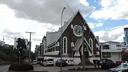 A Baptist Sunday school operated in South Brisbane from 1857, but it was not until July 1872 that a congregation was formed, meeting in the South Brisbane Mechanics Institute.[18] On Sunday 17 May 1974 the Vulture Street Baptist Church opened at 218 Vulture Street (corner of Christie Street, 27°28′59″S 153°01′39″E / 27.4831°S 153.0275°E).[19][20][21][22] It was later renamed the South Brisbane Baptist Church. The church was rebuilt in 1966, reopening on 10 December 1966. In 2003 it was renamed the South Bank Baptist Church to reflect its proximity to the South Bank Parklands. It was demolished in early 2013 when the congregation moved to a new church at 859 Stanley Street, Woolloongabba, renaming itself as Church@TheGabba.[23][24][25]