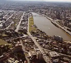 South Brisbane is on the southern bank of the Brisbane River, bounded to the north-west, north, and east by the median of the river.[4] It adjoins the suburbs of Woolloongabba to the east, Highgate Hill to the south, and West End to the southwest. The river to the east of South Brisbane is the South Brisbane Reach.(27°28′26″S 153°01′20″E / 27.4738°S 153.0222°E).[5] The suburb is directly connected to the central business district across the river by the following bridges (upstream to downstream):