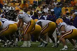 Garcia was named the starter for a home game against defending national champion No. 13 LSU.[128] South Carolina led at halftime but was suffocated in the second half, acquiring their third seven-point loss.[129][120] One moment during the game, in which the umpire collided with Garcia, went viral.[130][131] Staying with home-field and Garcia, the Gamecocks bounced back with a dominant win over Tennessee, their first home victory over the Volunteers since 1992.[130] Alternating between Garcia and Smelley every other snap, at home, South Carolina defeated Arkansas, now without their star running backs.[132] Kenny McKinley became the program's all-time leader in career receiving yards.[132] Continuing the quarterback switching and back at No. 24 in the polls, the Gamecocks were blown out by fifty points at No. 3 Florida, their worst loss since 1995 and Spurrier's worst ever in the Swamp.[133] With Smelley starting on the road, the Gamecocks endured a second straight loss to Clemson,[120][134][128] which cemented the job of Tigers interim head coach Dabo Swinney.[135] South Carolina returned to the postseason with an invitation to the Outback Bowl, with Spurrier tying the school record for bowl game appearances by a coach.[10] It was also the first time South Carolina had been invited to three bowl games in four seasons.[10] Prior to the bowl game, offensive line coach Jon Hunt was fired,[136][137] while recruiting coordinator and quarterbacks coach David Reaves as well as strength and conditioning coach Mark Smith both took jobs at Tennessee, under Reaves' brother-in-law Lane Kiffin.[c] In the bowl game, with Garcia starting against Iowa, the Gamecocks had five turnovers, were unable to stop running back Shonn Greene, and lost by three touchdowns.[141][128] South Carolina finished the season with a record of 7–6.[120]