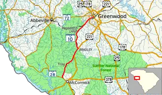 SC 10 is a 22.7 miles (36.5 km) two-lane, minor state highway in the southwest portion of the Upstate of South Carolina. The route runs generally south to north. Most of the route (particularly the southern portion) runs through or alongside the Sumter National Forest. The route begins just northwest of McCormick heading north to where is it begins a brief concurrency with US 221. The route continues on northward to Greenwood, where it enters the city's southwest side, ending at the US 25 Bus./US 178 Bus./SC 34 concurrency.[3]
