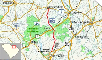 SC 102 begins at an intersection with U.S. Route 15 Business (US 15 Bus.; North 5th Street) in North Hartsville, within Darlington County, where the roadway continues as Patrick Highway. It travels to the north-northeast and leaves the city limits of the city. It travels through rural areas of the county. Then, it crosses over Cedar Creek, where it enters Chesterfield County. SC 102 curves to the north-northwest for a short while before traveling in a fairly northerly direction. Just before entering Patrick, the highway goes through Sand Hills State Forest. In town is an intersection with US 1 (Main Street). It winds its way through rural areas of the county until it meets its northern terminus, an intersection with SC 9 (East Boulevard) in Chesterfield, where the roadway continues as South Craig Street.[3]
