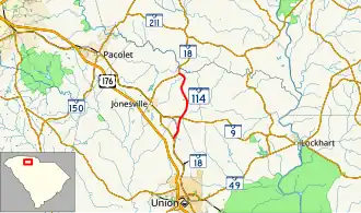 South Carolina Highway 114 (SC 114) is a 6.360-mile-long (10.235 km) state highway in the U.S. state of South Carolina. The highway travels through rural areas of Union County. The highway has both termini at SC 18 and passes to the east of Jonesville. It is officially designated as a west–east highway, but is physically north–south.