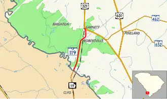 SC 119 begins at the Georgia state line, within Jasper County, where the roadway continues as Georgia State Route 119 (Railroad Avenue). It travels to the north-northeast, through rural areas of Jasper and Hampton counties and has an intersection with U.S. Route 321 (Columbia Highway) in Garnett.[3]