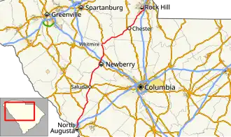 The third, and current, SC 121 was established in 1962-1964, which formed a three-state route (continues south as Georgia State Route 121 and Florida State Road 121 to Lebanon Station, Florida). From North Augusta to Rock Hill, it was placed on concurrencies with various highways throughout the state; with exception around Whitmire, where it replaced part of SC 19. Its routing has remained unchanged since inception.[11][12][13][14]