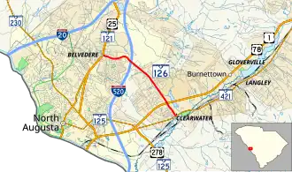 South Carolina Highway 126 (SC 126) is a 4.200-mile (6.759 km) primary state highway in the U.S. state of South Carolina. It directly links Belvedere with Clearwater, with a small portion in North Augusta.