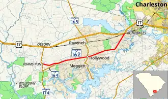 South Carolina Highway 162 (SC 162) is a 13.540-mile (21.791 km) state highway in the U.S. state of South Carolina. The highway connects Adams Run and Rantowles, via Hollywood.