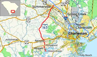 South Carolina Highway 165 (SC 165) is a 28.393-mile (45.694 km) state highway in the U.S. state of South Carolina. It connects Yonges Island to U.S. Route 17 (US 17) in Ravenel and US 17 Alternate in Summerville.
