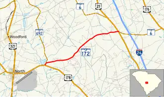 SC 172 begins at an intersection with U.S. Route 178 (US 178; North Road) east-northeast of North, within Orangeburg County. It travels to the north-northeast. Approximately 1,000 feet (300 m) later, it meets the eastern terminus of SC 692, with SC 172 heading to the east-northeast before it enters Calhoun County. It passes by the Do-Little Field airport just before it meets US 21 (Columbia Road). SC 172 continues another 0.09 miles (0.14 km) to end at SC 6 (Caw Caw Road).[3]