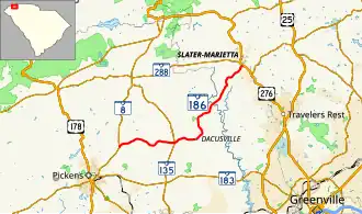 SC 186 begins at an intersection with SC 8 (Pumpkintown Highway) northeast of Pickens, within Pickens County. It travels to the east-northeast and curves to the southeast before crossing over Shoal Creek. Farther to the east is an intersection with SC 135 (Dacusville Highway). The highway curves to the northeast and travels through Dacusville. SC 186 curves to the north and crosses over Shoal Creek again. It curves to the northeast and crosses over the Saluda River on an unnamed bridge, which marks the Greenville County line. Upon crossing over Beaverdam Creek, the highway enters Slater-Marietta. A short distance later, it meets its eastern terminus, an intersection with U.S. Route 276 (US 276; Geer Highway).[3]