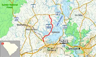 SC 188 begins at an intersection with SC 28 (Blue Ridge Boulevard) northwest of Seneca, within Oconee County, where the roadway continues as Bountyland Road. It travels to the north-northwest and then curves to the northeast just before passing Oconee Christian Academy. It crosses over Cane Creek on the McMahan Bridge. Just south of White Harbor, it crosses over part of Lake Keowee on an unnamed bridge. North of White Harbor, it passes Keowee Elementary School. East-northeast of Walhalla, the highway meets its northern terminus, an intersection with SC 183.[2]