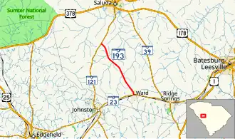 South Carolina Highway 193 (SC 193) is a 6.930-mile-long (11.153 km) state highway in the U.S. state of South Carolina. The highway connects Ward and rural areas of Saluda County.