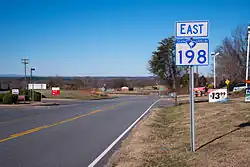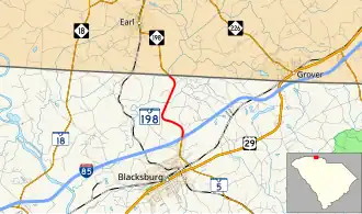 South Carolina Highway 198 (SC 198) is a 2.660-mile (4.281 km) primary state highway in the U.S. state of South Carolina. It connects the town of Blacksburg at Interstate 85 (I-85) exit 102 and the northern terminus of SC 5 with the town of Earl, North Carolina by way of North Carolina Highway 198 (NC 198). Though it physically travels north and south, internal SCDOT data and the only signage of SC 198 at the I-85/SC 5 interchange indicates that it travels east–west.[1][2]